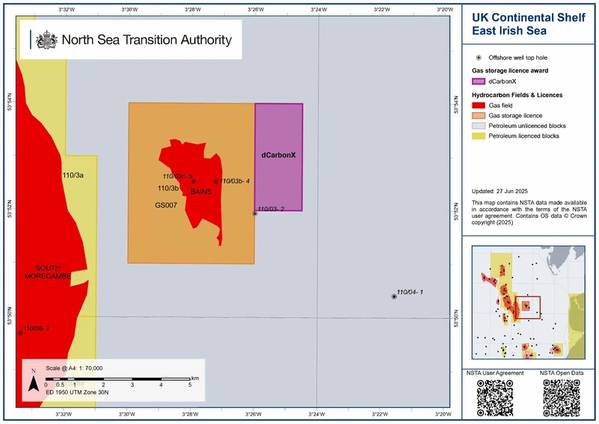 The NSTA offered dCarbonX Ltd a license for gas storage in the East Irish Sea on August 11, 2025. The license allows dCarbonX Ltd to make progress towards seeking the necessary regulatory approvals required before gas storage operations can commence, including further approvals from the NSTA.The relevant license area can be viewed here.